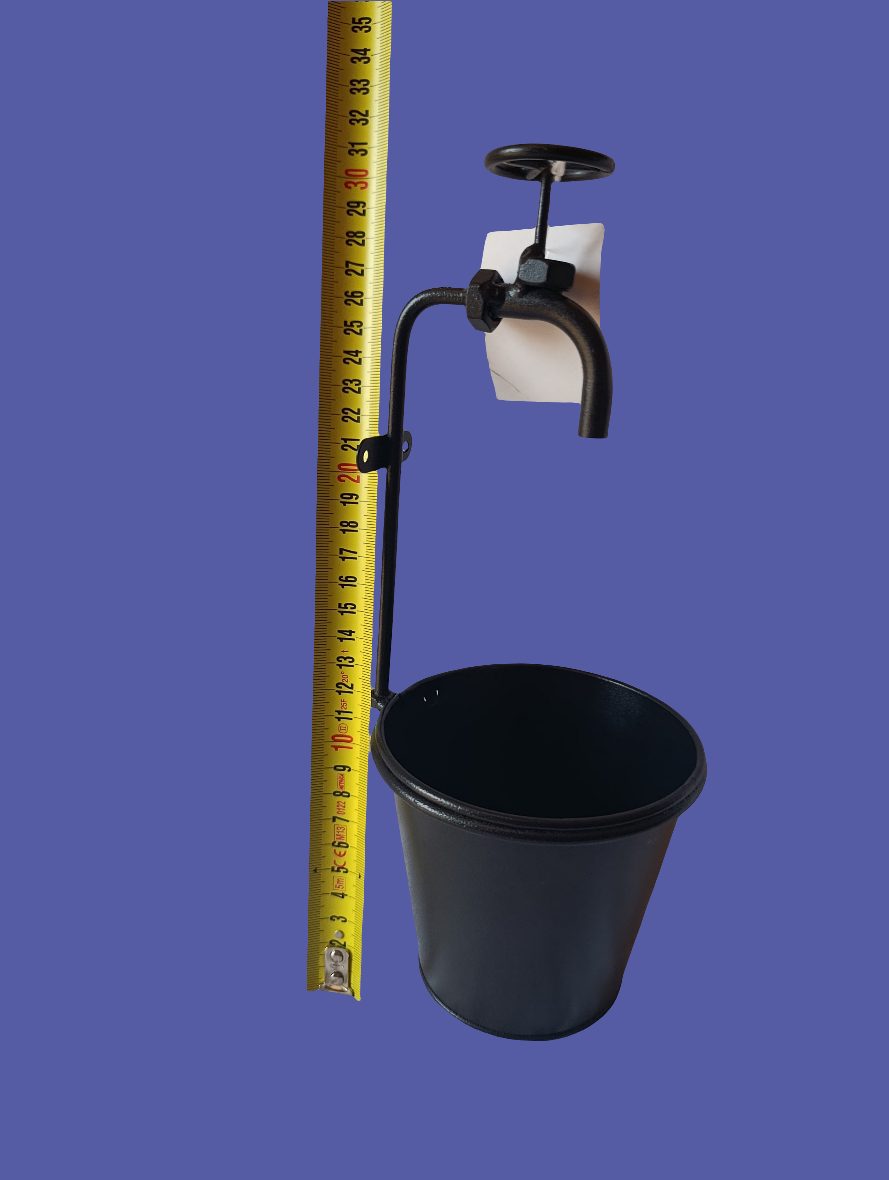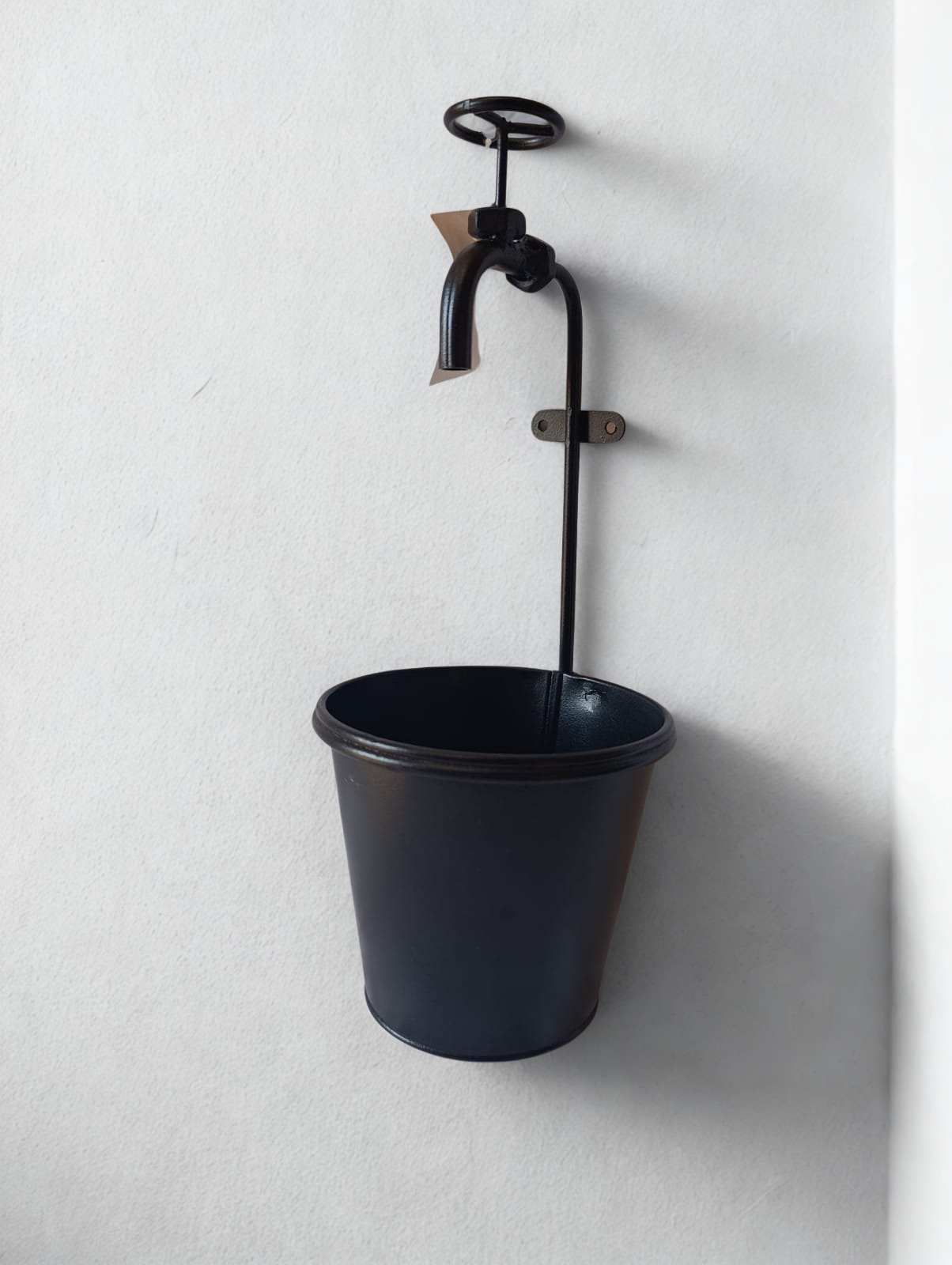 portavaso o portaoggetti da appendere ,per interni ed esterni , di colore nero a forma di secchielllo con rubinetto decorativo.